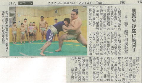 ![]() 愛媛新聞 2025年12月14日付 17ページ 「風賢央 後輩に胸貸す」 掲載許可番号 d20251222-02 |
